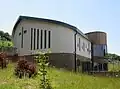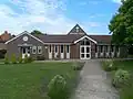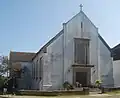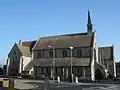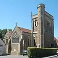 After the English Reformation, Roman Catholic worship was illegal in England for nearly 250 years until 1791,[25] and it grew slowly thereafter in comparison to West Sussex, where many large estates were owned by gentry who secretly kept the faith over many generations.[26] Ill-feeling towards Catholics apparently persisted well into the 19th century in Battle, where the 1886 Church of Our Lady Immaculate and St Michael was set well back from the street (in the garden of its presbytery) and does not have an ecclesiastical appearance.[27] In the early 20th century, bolder architectural statements were made with the Gothic Revival church at Bexhill-on-Sea and the elaborate Italian Romanesque-style church at Rye, both of which are listed buildings.[28][29] Most of the other Roman Catholic churches in Rother district are simple mid-20th-century buildings, sometimes with distinguishing architectural features such as a modernistic portico-style entrance at the former church at Sidley,[30] dalle de verre glass at Burwash[31] and a Mediterranean-style blank-arcaded tower at Little Common.[32]