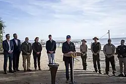 | California | Capitola, Aptos | January 19 | Arriving via Moffett Federal Airfield and flying to Watsonville Municipal Airport on Marine One, President Biden visited and surveyed the damage from severe flooding. He was joined by California governor Gavin Newsom and they met with business owners and local residents impacted by the devastation from recent storms at Capitola Pier. They also visited first responders, state and local officials to survey recovery efforts and delivered remarks on the recovery and rebuilding from the impact of recent extreme weather at Seacliff State Park.[10] |