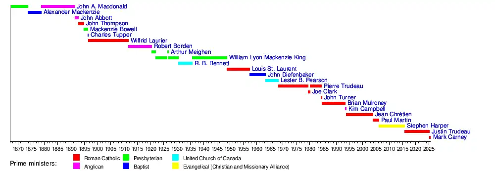 | Mark Carney | Liberal | Latin Church | March 14, 2025–present | ||||