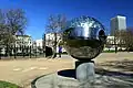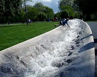 2004 | Kathryn Gustafson | — | Fountain | — | Unveiled 6 July 2004 by Elizabeth II.[27] A low, granite oval, 210 metres in circumference, with water coursing along it.[9] The fountain was plagued by blockages and injuries and had to be closed off twice for repairs in its first two years.[27] |