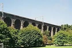 | Stockport Viaduct | Stockport, Greater Manchester | 546 m (1,791 ft) | 1840 | Brick arch | II | carries the West Coast Main Line across the valley of the River Mersey | ![]() |
