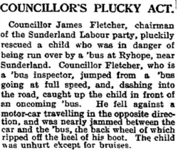 | 64 | James Fletcher | Bus inspector | 18 May 1930 | Jumped from a moving bus to pull a child from in front of another bus, being injured in the process. Also served as chairman of the Sunderland Labour Party at the time.[31][32][33] | |||