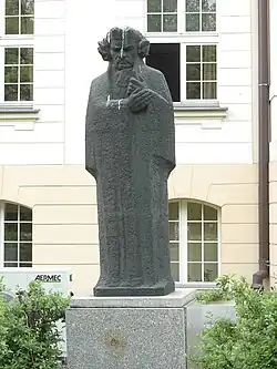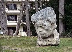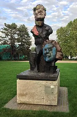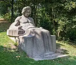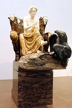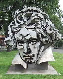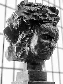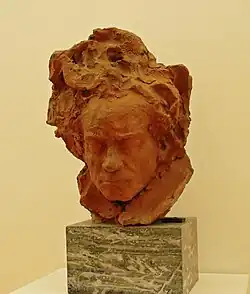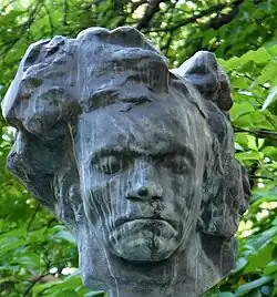 In the early 20th century, the glorified portrayals of Beethoven reached their peak, with god-like representations such as Max Klinger's monument (1902), unveiled at the Vienna Secession[11] (now in the Museum der bildenden Künste),[12] and Fidus's unexecuted design for a 'Beethoven temple' (1903).[13] The 20th century also saw a brief return to the simplistic style of the 19th century, such as Robert Weigl's statue at the Heiligenstädter Park in Vienna (1910) and Hugo Uher's statue in Karlsbad (1929).[14] Also at this time, Antoine Bourdelle and Naoum Aronson, both students of Auguste Rodin, began creating busts of the composer; Bourdelle was especially prolific.[15] As the century progressed, ideas on depicting Beethoven became largely ununified, and were often especially allegorical, such as Theodor von Gosen's monument in Alameda Central, Mexico City (1921).[16] In 1926, Berlin hosted a monument competition in preparation for the composer's 100th anniversary the following year; the entire competition was controversial and was eventually canceled due to criticism from the press and the committee's inability to form a consensus.[17] There had been submissions from famous sculptors including Ernst Barlach, Peter Breuer and Georg Kolbe, although Breuer and Kolbe eventually had their designs constructed in 1938 and 1948 respectively.[17] After World War II, experimentation in portraying Beethoven increased even further, exemplified by Klaus Kammerichs's three-dimensional reproduction (1986) of Joseph Karl Stieler's painted portrait and Markus Lüpertz's controversial abstract portrayal (2014).[18][19]