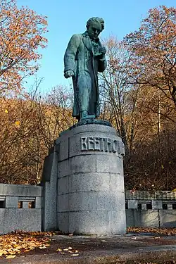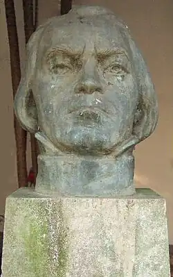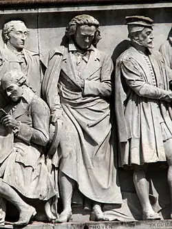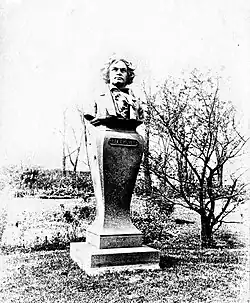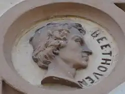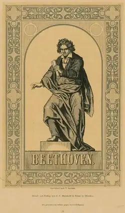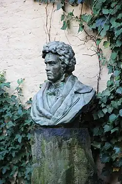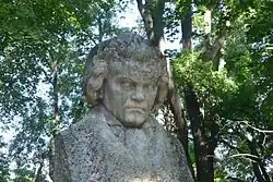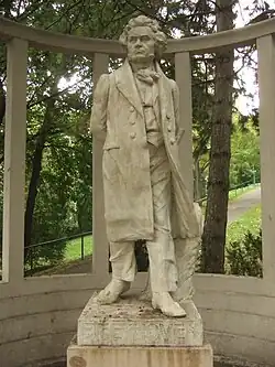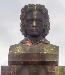 The German composer Ludwig van Beethoven (1770–1827) is among the most admired composers in the history of Western music,[1] and has been the subject of many private and public sculptures, including busts, reliefs, statues and others. The first, a bust by Franz Klein, was commissioned by Johann Andreas Streicher and created in 1812, while the composer was still alive.[2] After Beethoven's death in 1827, his hometown, Bonn, immediately began planning a monument for the following year,[3] though a cholera outbreak delayed this.[4] A design competition was eventually held, in which a submission by Ernst Julius Hähnel beat ones from Friedrich von Amerling, Gustav Blaeser and Friedrich Drake. In 1845, Hähnel's monument was erected, due to finances given by Robert Schumann, Charles Hallé, George Thomas Smart and especially Franz Liszt.[3][5] While the monument's height and simplicity were criticized, the reliefs surrounding the base were met with public approval.[5] The statue's representation of a figure standing on a decorated base with its legs slightly apart was popular at the time, and later inspired Theodore Baur's statue of c. 1895 in the Library of Congress.[6]