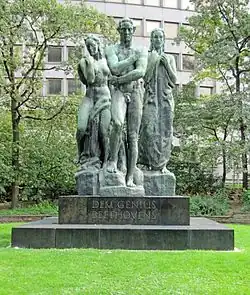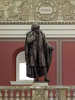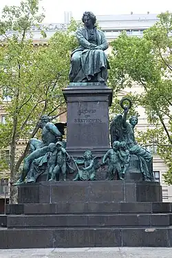 The Beethoven monuments that followed Hähnel's, while retaining a high pedestal,[7] began to portray the composer in a less simplistic and increasingly heroic light.[8] The most significant representative of this, and the most famous Beethoven monument from the second half of the 19th century, was Kaspar von Zumbusch's 1880 monument in Beethovenplatz, Vienna.[9] The city had intended to erect a monument for Beethoven since his death,[3] but serious action to do so began only in the 1870s, when a competition for a design was held and Zumbusch's winning design was created with financial support from Liszt and Brahms.[10]