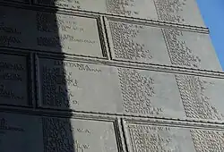 There are 24 sections of name panels on the First World War memorial and 132 name panels on the Second World War memorial, with the ships of the mercantile marine (later merchant navy) and fishing fleets listed separately. The largest losses of merchant seamen in single shipwrecks commemorated on these memorials are RMS Lusitania in the First World War and SS Ceramic in the Second World War.