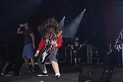 Trivium is an American heavy metal band from Orlando, Florida. Formed in 1999, the group's first recording lineup included vocalist and guitarist Matt Heafy, bassist Brent Young and drummer Travis Smith.[1] After a pair of demos,[2] the band released its debut studio album Ember to Inferno in 2003, which was written entirely by Heafy.[3] Guitarist Corey Beaulieu joined after the album's recording,[4] and the following year Paolo Gregoletto replaced Young.[5] The band released Ascendancy in 2005, which featured songwriting credits for Beaulieu and producer Jason Suecof.[6] The album was followed the next year by The Crusade, written by Heafy with Beaulieu and Gregoletto.[7] Also in 2006, the band recorded a cover version of Metallica's "Master of Puppets" for the Kerrang! release Remastered: Metallica's Master of Puppets Revisited.[8]