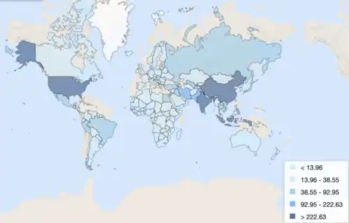 The following table provides information on annual freshwater withdrawal based on data published by World Bank[1][5][6][7][8][9] and Food and Agriculture Organization.[3] Sorting is alphabetical by country code, according to ISO 3166-1 alpha-3.