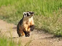 | American badger[7] | Taxidea taxus | Fossils of badgers are uncommon, making up little of the carnivoran fossils compared to canids and felids.[1] First referred to Taxidea americana, a synonym of T. taxus.[3] | ![]() | |