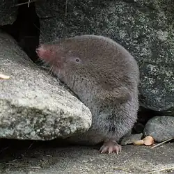 | Short-tailed shrew[1][3] | Blarina brevicauda | A single jaw in matrix. | Like with many other Port Kennedy mammals, Cope considered the material from the site to be of Blarina distinct, dubbing B. simplicidens in his 1899 monograph.[3] It has been recognized as a junior synonym of B. brevicauda.[29][1] | ![]() |