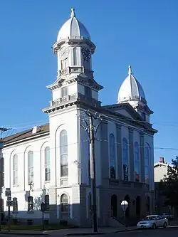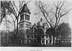 1882 | Milton Earl Beebe | Second Empire | NRHP-listed (refnum 80003449). It was built in 1880–1881, and is a 3+1⁄2-story, brick building. It features a mansard roof. Henry Shenk constructed it at a cost of $109,962. The building is a parallelogram with a 120 ft. of frontage on Center St. with a depth of 80 ft. The height to the eaves of the roof is 48 ft. The mansard slate roof has porthole dormers and elaborate chimneys and a decorative bracketed cornice. The central pavilion has flanking pilasters supporting a classic portico. Courtroom 1 was added in 1923. It is one of the largest courtrooms in the United States, with 500 seats. | [22][23] |
