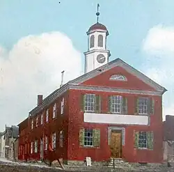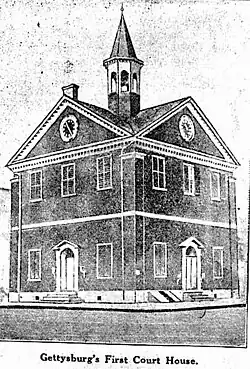 1858 | Stephen Decatur Button | Italianate | NRHP-listed (refnum 74001728). John R. Turner of Carlisle constructed the building. The building is two stories high, three bays wide, six bays deep and constructed of red brick, which was originally painted gray. Rear wings were added in 1895. A large clock tower reaches about 70 feet (21 m) above ground level. During the Battle of Gettysburg the building served as both a command post and as a hospital, for both Union and Confederate armies. | [2][3] | |
