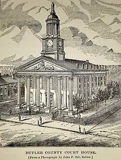 1885 | James P. Bailey | High Victorian Gothic | NRHP-listed (refnum 77001132). It was built in 1885, and is a three-story, brick and sandstone building. It features a large central, four-faced clock tower with two double pyramid shaped roofs. It is the tallest structure in downtown Butler. The first and second floors are designed to be gothic and art deco with several crown moldings, domed ceilings, marble floors and walls, and woodwork. | [20][21] |