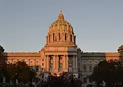 1906 | Joseph Miller Huston | Beaux Arts | The Supreme Court, and the Superior Court meet at different times of the year in courtrooms in Harrisburg, Philadelphia, and Pittsburgh. The Superior Court also occasionally holds sessions in other parts of the state. The Supreme and Superior Court Chamber in the capitol building is used by both courts and was designed using ancient Greek and Roman themes. It is located on the fourth floor of the capitol, on the east side of the rotunda. A cycle of 16 panels, painted between 1917 and 1927, begins and ends with Divine Law as its keystone, over the main entrance. Around the room clockwise the murals represent the Law of Nature; Greek, Hebrew, and Christian Revealed Law; Roman Law of Reason; English Common Law; William Penn as Law-Giver; State, National, and International law, and finally, the Spirit of Divine Law. A stained-glass dome, designed by Pennsylvania native Alfred Godwin, is in the center of the ceiling. | |