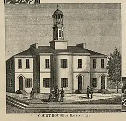 1799, 1860 | unknown | Pennsylvania Historical Marker Text: Two Dauphin County Courthouses occupied this site. The first, built 1792–99, served as the State House for the Pennsylvania Legislature from 1812 to 1821. It was removed in 1860. The second stood here from 1860 to 1948. (The 1792 courthouse in the illustration is shown in 1858.) | ||