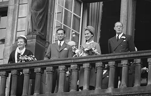 King Bhumibol Adulyadej and Queen Sirikit appearing on the balcony of Royal Palace of Amsterdam ; from left to right: Queen Juliana of the Netherlands , King Bhumibol Adulyadej, Queen Sirikit and Prince Bernhard of Lippe-Biesterfeld , 25 October 1960