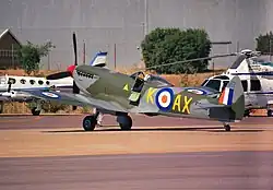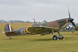 - Spitfire Tr.9 MJ772 (PH-KDH). Served with 341 Squadron, Royal Air Force as NL-W then with 340 Squadron as GW-A. Sold to Vickers-Armstrongs in 1950, converted to two-seat trainer. Carried Class B markings G-15-172. To Irish Air Corps in May 1951 as IAC 159. Withdrawn from flying in 1960. Sold to Film Aviation Services in November 1963 and stored at Biggin Hill. Sold to COGEA, Belgium in May 1964 and stored at Ostend Airport. Sold to Tony Samuelson in 1965 and registered G-AVAV in November 1966. Restored to airworthyness in July 1967. Leased to Spitfire Productions Ltd for use in the film Battle of Britain. A forced landing was made at Little Staughton on 9 July 1968 due to engine failure, and subsequently returned to flying condition. Later sold to Sir William Roberts and displayed as part of the Strathallan Collection, coded NL-R. Sold to Doug Champlin of Enid, Arizona, registered N8R. Later registered in Germany as D-FMKN.[85] Suffered off-airport landing in field, near Woodchurch, Kent, United Kingdom, on 7 September 2015. Pilot uninjured.[86][87] As of March 2019, airworthy owned by Warbird Experiences Ltd, based at Biggin Hill airfield.[88] In August 2021, MJ772 was flown to its new home in The Netherlands.[89]