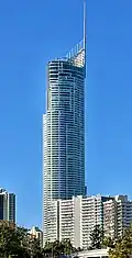 By the mid-2000s, another real estate boom on the Gold Coast was taking shape.[9][10] The city's tallest buliding, the supertall skyscraper Q1, was completed in 2005. It was the tallest building in the southern hemisphere as well as the tallest residential building in the world at the time, and remains the tallest in Australia today. Its form, with a slanted roof, was inspired by the Sydney Opera House as well as the Olympic torch in the 2000 Olympics that had taken place five years prior in Sydney.[11] The skyscraper has an observation deck, known as SkyPoint (formerly QDeck), which allows views of the Gold Coast skyline, as well as Brisbane to the north.