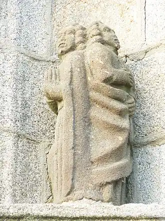 | Remains of a Calvary | Bourg-Blanc | There are the remains of a calvary in the Église Notre-Dame consisting of a statue of John the Evangelist reversed with an unidentified saint. They are kept in a niche in the south porch.[1]