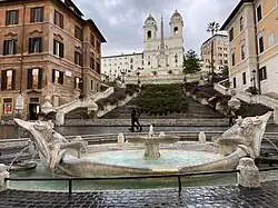 One of the city's top attractions, the flight of 138 stairs is the biggest in Europe.[11] They are topped by the Trinita dei Monti church, and below there is the large Piazza di Spagna. The Piazza di Spagna is also a major shopping destination in the city, and hosts several designer boutiques such as Missoni. |
