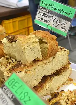 Pierekaczewnik is a meat pie consisting of 6 very thin layers of dough, interspersed with either meat (mutton, beef, goose or turkey), raisin/cheese (cottage cheese and/or raisins) or fruit (apples or dried plums), which originates from the Tatars.[50]
