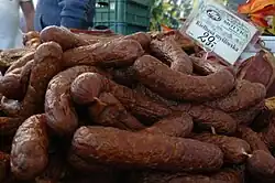 Суджук Търновски / Sudzhuk Tarnovski / Търновски Суджук / Tarnovski Sudzhuk is a horse shoe shaped pressed meat product made from "ground beef, auxiliary ingredients and natural seasonings (black or white pepper, savory, cardamom and allspice), stuffed into natural bovine or porcine small intestine casing with a diameter of up to 40 mm". It was named after Veliko Tarnovo, capital city of the Second Bulgarian Empire.[15]