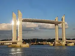 • Pont Gustave-Flaubert – crossing the Seine at Rouen, this lift bridge is the highest vertical-lift bridge in Europe, allowing ships up to 55 m tall to pass under it. It is 670 m long, with a span of 116 metres[3]. A striking design feature, the two road sections are mounted outside the central towers. The bridge was designed by François Gillard and Aymeric Zublena and opened to road traffic on 25 September 2008. It is named after the author Gustave Flaubert who was born in Rouen.[4]