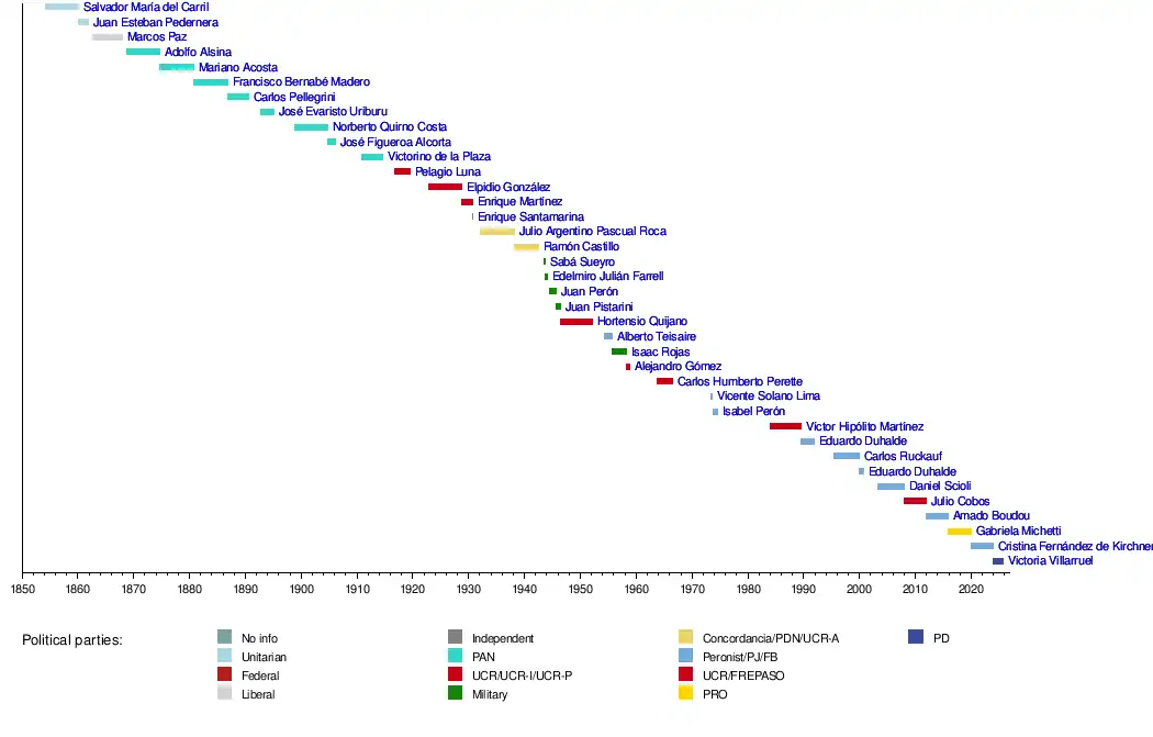 12 October 1886 | 6 August 1890 | 1886 | PAN | Miguel Juárez Celman | Assumed the presidency after the resignation of Miguel Juárez Celman. | |