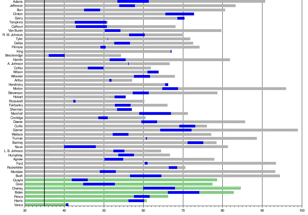 The following chart shows vice presidents by their age (living vice presidents in green), with the years of their vice presidency in blue. The vertical black line at 35 years indicates the minimum age to be vice president.