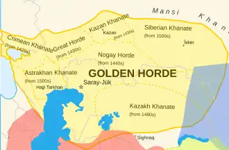 - ^ a b Depends on whether or not Ulugh Muhammad was considered Golden/Great Horde khan at this time, when it was effectively locked in a war of succession. Ulugh had been claiming to be khan of the Golden Horde since 1419 (deaths of Edigu and Qadir Berdi). He had several competitors, including Hajji Muhammad (successor of Edigu in Sibir), Dawlat Berdi (1420s in Crimea), Barak Khan (1423–1429), Sayid Ahmad I (from 1427) and Küchük Muhammad (early 1430s). Ulugh lost control of the Golden Horde in 1436, first retreating to Crimea, then moving to Belyov in 1437, before settling in Kazan in 1438 and founding the Khanate of Kazan there.