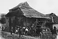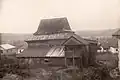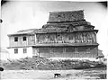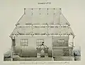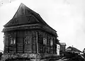 1750–1918 | The large, rectangular main hall measured 10.80 x 8.60 m and was surrounded on three sides by lower rooms: to the west by the vestibule and to the south and north by the prayer rooms for women. The entrance to the vestibule and from there to the main hall on the west side was through a portico with a gable supported by columns. To the north and south of this side there were corner pavilions, which had access to the women's prayer rooms on the ground floor and stairs to the rooms on the first floor. The women's rooms each had three rectangular windows; above each wall there were two pairs of windows that let the light into the main hall. The roof had up to four stories, which consisted of concave, convex and straight slopes. These were separated from each other by cornices of different heights. There was a decorative frieze between the first convex roof and the second concave. The corner pavilions had two-story tent roofs, the roofs of the women's rooms leaned against the side walls. The design of the entire building indicated that the main hall, vestibule, women's rooms and corner pavilions were built at the same time. | ![]()