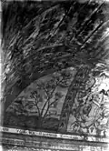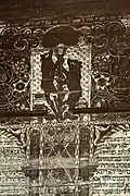 1750–1941 | The synagogue building was a wooden structure built on a stone foundation. The walls of were cut from edged logs into a clean corner. The central log house was dominant in height, to which side log houses were adjoined as covered galleries. A pentagonal structure was added to the main facade, which covered the main entrance. The building was covered with a high gable roof, with a complex plan and numerous outbuildings. In the end of 19th - beginning of 20th century the roof was covered with tin.[6] The interior was almost entirely covered with magnificent polychromes made in 1745 by the Słuck painter Chaim ben Yitzchak ha-Levi Segal. Murals, made on boards, represented the images of 12 signs of the zodiac, mythical animals and cities. Some researchers noted that under the image of mythical cities features of Mogilev from the times of the Polish-Lithuanian Commonwealth were visible. These murals were studied by El Lissitzky and Issachar Ber Ryback. | ![]() ![]()