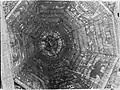 It consisted of a square (12 × 12 m) large main hall. The walls were 6 m high; it was 10.20 m to the highest point of the vault, and the floor was a few steps lower than the outer rooms. On the west side there was a vestibule and above it a gallery with arcades. A two-story corner pavilion stood to the right and left. The north and south sides were flanked by women's dreams. The main building had a three- story tent roof, with the upper step transitioning to an octagonal point. The corner pavilions had a two-story roof. Inside, four wooden pillars supported the vault; they divided the floor plan into nine equally sized fields. In the middle stood the bima; it was in the shape of an octagonal arbor with a canopy with a crown on the top. | ![]()
