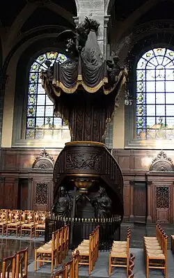During period of exile in Brussels 1816-1827 | The church's wooden pulpit (La Chaire de vérité). A wooden composition, five figures in ronde bosse and the reliefs La Foi and l'Espérance with a depiction of an archangel, two angels and a scene showing the stoning of St Étienne (St Stephen).[23] | |