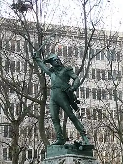 There was a monument dedicated to Rude in Dijon with a bronze sculpture by Joseph Tournois dating to 1886. The inscription details Rude's principal works. Tournois depicts Rude using a mallet and chisel and wearing a smock (paradessus). The inauguration took place on 18 October 1886. In 1942 under the Vichy régime de Vichy the statue was removed and the bronze melted down. In 1953 a new statue of Rude was erected in its place in Auguste-Dubois, the work of the sculptor Vigoureux.[59] | |||