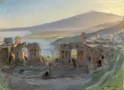 Evening landscape by the ancient theatre in Taormina with a view of Etna and the Gulf | 1901 | 32 × 43 cm | |||