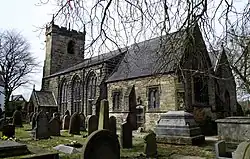 c. 1500 | The oldest part of the church is the tower, the nave was built in 1817, and the chancel was rebuilt in 1869–70. Most of the church is constructed in sandstone, with the nave in gritstone, and the roof in slate. It consists of a nave with a south porch, a chancel with a north chapel, and a west tower. The tower is in Perpendicular style, it has a west doorway, a southeast stair turret, and a clock face. At the top is a battlemented parapet, gargoyles, and crocketed corner pinnacles.[2][3][4] | II |