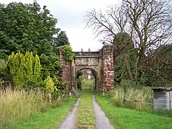 c. 1460 | The gatehouse to the hall, now partly in ruins. It is constructed in sandstone, forming an archway above the entrance to the drive. The surviving features include the arch, which is four-centred with colonnettes (small columns), the springers of the fallen vault, and octagonal canted mock turrets supported by buttresses at the four corners.[3][4] | II* |