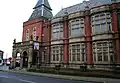 1886 | The library and museum, designed by Thomas Worthington, are in brick with stone dressings, bands, a top cornice, a parapet, and a slate roof. There are two storeys with a basement and six bays. The first bay projects forward and contains an entrance porch and has a pyramidal roof. The porch projects further and has two round-headed arches with round piers, octagonal turrets on the corners surmounted by heraldic beasts, an inscribed frieze, and a balustrade. The bays to the right have half-octagonal shafts with finials, and the middle three bays contain two-storey bay windows with mullions.[13][14] |