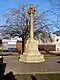 1923 | The war memorial is in pale cream stone. It has an octagonal stepped base, a podium, and a moulded stepped plinth. On this is a cross with a chamfered foot, an octagonal tapering shaft, and a cross with tapering arms. On the front is a sword in relief and a wreath. On the base and the podium and inscriptions and the names of those lost in both world wars.[19] | II |
