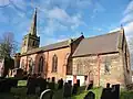 14th century (probable | The oldest part of the church is the tower, most of the building dates from 1761, and the chancel was added in 1881 by Ewan Christian. The nave is built in red brick, the rest of the church in stone, and the roof is slated. The church consists of a nave, a chancel, and a west steeple, the tower embraced by the nave. The tower has a vestry projection to the south, a stair projection to the north, two stages, a west doorway with a segmental head, a north clock face, a string course, an embattled parapet, and a recessed spire.[2][3] | II |