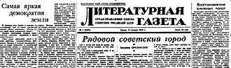 Literaturnaya Gazeta (Russian: Литературная Газета, Literary Gazette) is a weekly cultural and political newspaper published in Russia and the Soviet Union. It was published for two periods in the 19th century, and was revived in 1929.[1]