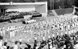 The Lithuanian Song and Dance Festival (Lithuanian: Lietuvių dainų ir šokių šventė), colloquially known also as the Song Celebration (Lithuanian: Dainų šventė) is a Lithuanian massive traditional song and dance festival.[1] It takes place roughly every four years. The event has been a national celebration throughout the interwar and upon Lithuania regaining its independence in 1990. The main event is traditionally hosted at Vingis Park in Vilnius.