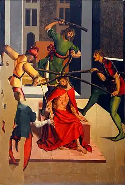 The tormented Christ, sitting on a stone seat, is partly covered by a red robe. Three bailiffs press a crown of thorns down on his head using long wooden poles. The fourth person in the spot where the painting is heavily damaged has his back turned to us and is giving Christ a bulrush as a sceptre. The figure of Christ has a spiral composition and the figures surrounding him are portrayed in contraposition, emphasising their movement. The space is deepened by diagonally depicted architectural elements and by the contrasts of illuminated and shaded areas. The scene is loosely inspired by a print by the Master E. S.
