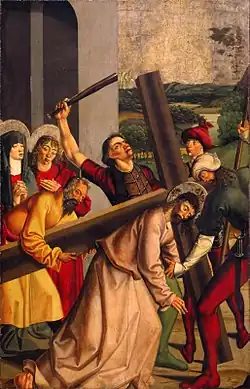 Christ, dragging on his shoulder a large T-shaped cross, is portrayed before the Gate of Jerusalem. The background features a landscape with a river and distant mountains; the lowered horizon deepens the space beyond. The sky is replaced by silver background. The man in yellow clothing helping Christ to carry the cross is Simon of Cyrene. In the foreground, a soldier with a spear is lifting up the flagging Christ while another man is about to hit Christ with a cudgel. Christ is accompanied by a praying Virgin Mary and a weeping John the Apostle who has a resigned expression on his face. This scene was modelled on prints by the Master E.S. and Martin Schongauer. Its composition has much in common with a later painting by an unknown master of the Danube School (c. 1520) that is in the collection of the Slovak National Gallery.[16]