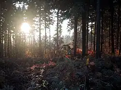 At the north-east centre of the parish is Athelstans (or Athelstan's) Wood, rectilinear of 1,200 yards (1,000 m) by 800 yards (700 m) and extending to all but 100 yards (90 m) across the parish. The wood is conjoined at north to Rough Hill Wood in Aconbury parish.[9][10][11][12] Athelstans Wood, named after Athelstan, Bishop of Hereford (died 1056), became a royal wood along with Aconbury Wood and Harewood. Aconbury Priory was established by King John, who gave priory nuns felling and selling rights to Athelstans Wood. Following the Dissolution of the Monasteries in the 16th century, the woods became the property of the Scudamore family, who until at least the 18th century coppiced the wood to make charcoal for fueling forges, while oak bark was used in the leather tanning process. The extent and characteristics of the wood remained the same from this time until after the Second World War, witnessed by aerial photographic evidence of 1946. Before felling from the 1950s, making room for the wide commercial coniferisation of the 1970s approved by the Forestry Commission, the woods were of lime and ash, with "oak and sweet chestnut trees and the sheets of bluebells and wood anemones under the coppice".[24]