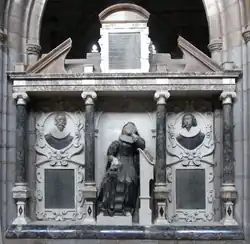 Tuckfield Monument in Crediton Church. Left: John II Tuckfield (1555–1630), who purchased Little Fulford; right: Thomas I Tuckfield (1580/90–1642), his son and heir; and centre: Elizabeth Reynell (1593–1630), Thomas's wife. Like the adjoining monument to Sir William Peryam it is situated in a place of great honour, against the north wall of the chancel, near the high altar