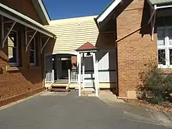The west wing, probably built in 1919, is high set with play space and a tuckshop under the building. The upper floor originally contained three separate classrooms but has been modified to house the staff room in one original classroom space, with the library occupying two classrooms with the dividing wall removed. Large bays of casement windows to each end wall remain, with the top bay of windows set inwards at an angle. Window hoods with timber brackets and lattice panels protect these windows. Access to the classrooms is provided by double timber doors with fanlights above. A separate brick office, originally for the principal, is accessed from the verandah of this wing. It is a gable roofed extension set at 90 degrees to the building with a single double-hung window.[1]