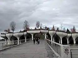Arup Group oversaw the structural design of the park.[7][8] Little Island is supported by 132 pot-shaped structures suspended above the water.[7][9] These "tulip pots" vary in height and are between 15 and 62 ft (4.6 and 18.9 m) above the mean waterline.[7] This was meant to protect the park from a 500-year flood, in which the water level in the river rises as much as 11 ft (3.4 m).[10] The heights of the pots were intended to give the appearance of a floating leaf[2] or a wave.[10] Numerous other firms were involved in the structural design, including precast cement contractor Fort Miller Company, marine consultant Mueser Rutledge Consulting Engineers, and marine contractor Weeks Marine.[10]