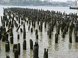 The City Club of New York filed a lawsuit to stop the park's construction in 2015, alleging that the plans had not undergone a proper environmental review and that the project was instead using an old review conducted on the demolition of the adjacent Pier 54. According to the City Club, the trust had concluded there were no adverse environmental effects in installing 547 deep pilings for the park. The New York State Department of Environmental Conservation (DEC) and the United States Army Corps of Engineers (USACE) had yet to approve plans for the park.[25][26] The DEC approved the plans in March 2016. The next month, a judge for the New York Supreme Court dismissed the case.[27][28] The City Club filed an appeal, and a hearing was scheduled for September 2016. In the meantime, an appellate court placed an injunction in June 2016, temporarily stopping any further work from proceeding.[29][30][31] Less than a month later, the injunction was partially lifted, allowing work on nine pilings to proceed.[32][33][34] At the appellate hearing, representatives of Pier 55's developers argued that the trust had performed a proper environmental review.[35][36] The court rejected the City Club's appeal.[37] The suit was escalated to the New York Court of Appeals, which also rejected the appeal.[38][39]